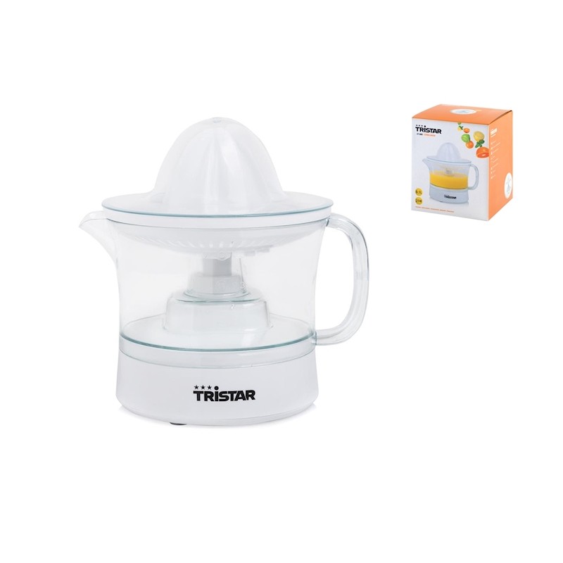 Spremiagrumi elettrico con 2 coni di spremitura. potenza 25 watt. capienza 0, lt, rotazione destra e sinistra, maniglia di trasporto, coperchio trasparente, filtro polpa, completamente smontabile facile da pulire, indicatore di contenuto massimo, adatto per l'uso in campeggio.