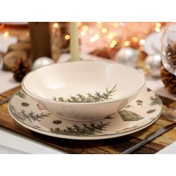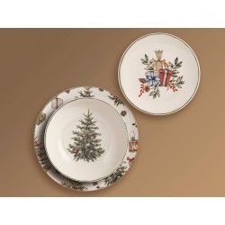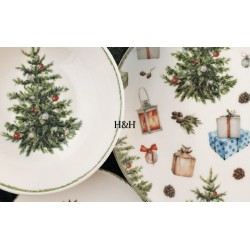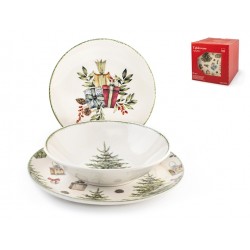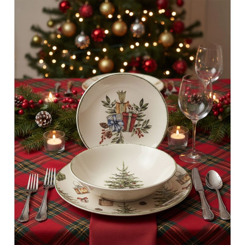 Servizio 18 pezzi tavola christamas carol in stoneware decorati composta da 6 piatti piani cm 26, 6 piatti fondi cm 20,5, 6 piati frutta cm 19,5. idonei al lavaggio in lavastoviglie e all'uso in forno a microonde
