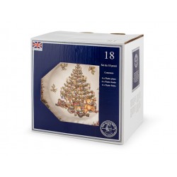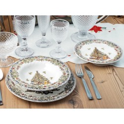 Servizio 18 pezzi tavola seasons greetings in earthenware decorato. composto da: 6 piatti piani cm 25,5, 6 piatti fondi cm 22, 6 piatti frutta cm 20,5. idonei al lavaggio in lavastoviglie e all''uso in forno a microonde
