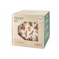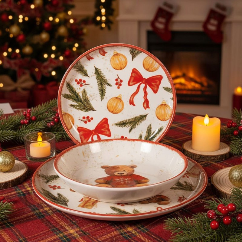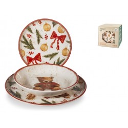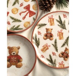 Servizio 18 pezzi tavola teddy hugs in stoneware decorato , composto da 6 piatti piani cm 26, 6 piatti fondi cm 20,5, 6 piatti frutta cm 19,5 forma nordic. idoneo al lavaggio in lavastoviglie e all'uso in forno a microonde.