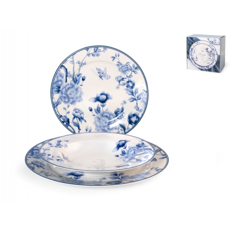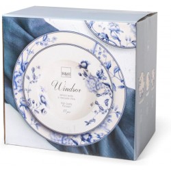 Servizio tavola 18 pezzi Windsor realizzato in New Bone China composto da: 6 piatti piani ø 27 cm, 6 piatti fondi ø 21,5 cm e 6 piatti frutta ø 20,5 cm. Una scelta eccellente per creare una tavola sofisticata ed incantevole.
