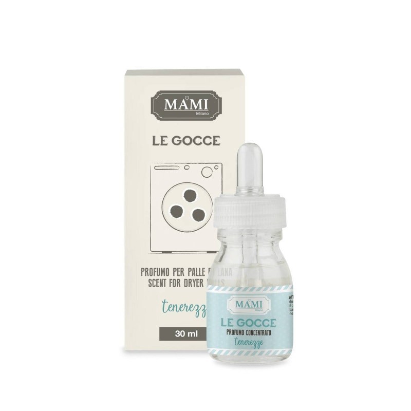 Gocce Asciugatrice 30 ml MAMI Milano donano un delizioso profumo al bucato nella fase di asciugatura in asciugatrice. Grazie alle Palle di Lana la fragranza concentrata delle Gocce viene diffusa nei tessuti che restano profumati a lungo.